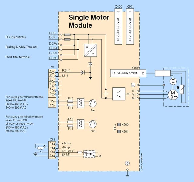 Одноосевой модуль подключается к CU320 или модуль управления SIMOTION D через интерфейс DRIVE CLiQ.