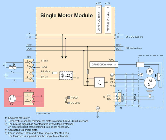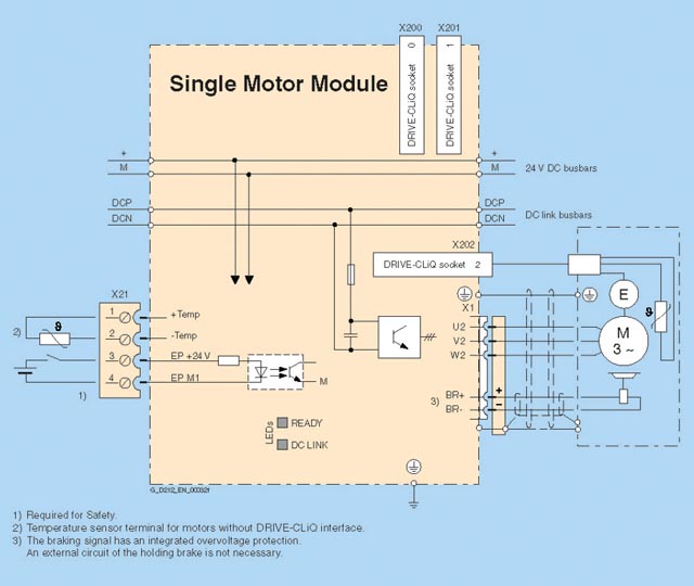 Одиночные модули двигателя взаимодействуют с блоком контроля CU320 или SIMOTION D по интерфейсу DRIVE-CLiQ.