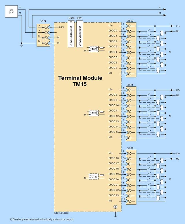 Клеммный модуль TM15 подключается на Блок управления CU320 через DRIVE-CLiQ.