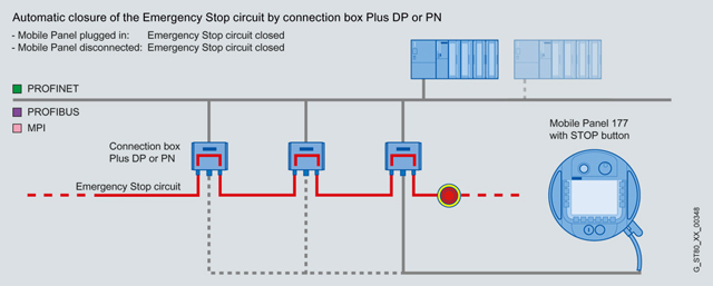 Если мобильная панель с кнопкой STOP используется вместе с соединительными коробками версии "Plus", возможна конфигурация в которой сочетается гибкое использование мобильной панели и интеграции ее в цепь экстренного останова оборудования. Цепь экстренного останова остается сомкнутой независимо от того подключена мобильная панель к соединительной коробке или нет. Когда мобильная панель подключена, она включается в цепь экстроенного останова и при нажатии кнопки STOP цепь разомкнется с вызовом функции останова. Если мобильная панель отключается во время работы, цепь экстренного останова в версии "Plus" соединительной коробки автоматически смыкается (пример конфигурации: Mobile Panel 177).