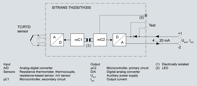 Выходной сигнал с термопреобразователя (2-х, 3-х, 4-х проводные схемы) или термопары преобразуется в цифровой сигнал с помощью аналого-цифрового преобразователя. Потом вычисляется на микроконтроллере ( C1), затем корректируется с характеристикой сенсора и передается на микроконтроллер ( C2), электрически изолированном. Аналоговый выход вычисляется, статус функции предварительно определен, данные с коммуникациями обработаны. По цифровому/аналоговому преобразователю, измеренное значение преобразуется в выходной токовый сигнал 4 ... 20 мA.