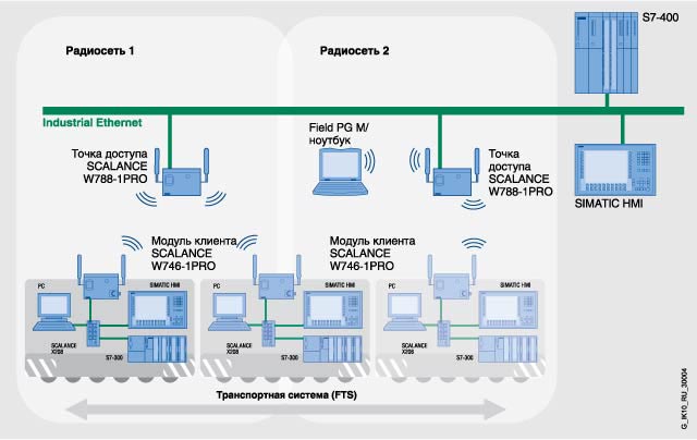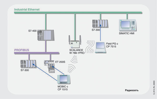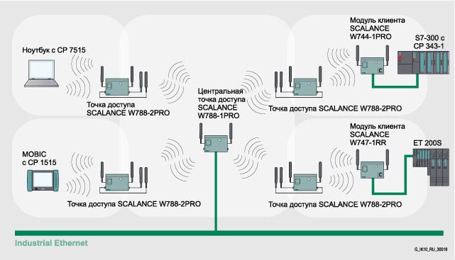 Инфраструктура сети может включать в свой состав несколько точек доступа, образующих зону сплошного охвата радиосвязью. В пределах этой зоны допускается свободное перемещение мобильных коммуникационных устройств (мобильные программируемые контроллеры, приборы MOBIC, программаторы Field PG), поддерживающих связь через ближайшую точку доступа. Если не используется распределенная система мобильной связи (WDE – Wireless Distribution System), то для мобильных станций переключение (роаминг) с одной точки доступа на другую выполняется автоматически. Wi-Fi совместимость позволяет использовать в таких сетях и продукты других производителей.