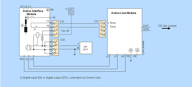 Вентилятор вращается при подключении 24 В DC питания и, при необходимости (срок службы, шум), может быть выключен через Блок управления через вход "Выключение вентилятора". Выключать вентилятор разрешено только когда питание системы не работает, иначе Активный интерфейсный модуль перегреется.