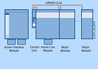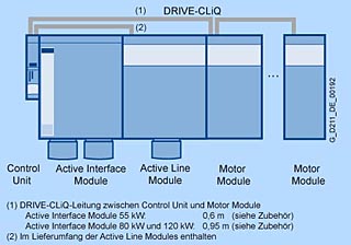 В зависимости от положения Активного интерфейсного модуля в системе приводов, могут потребоваться дополнительные кабели DRIVE-CLiQ. Если Активный интерфейсный модуль установлен с левой стороны Блока управления и Активного модуля питания, то никакие дополнительные кабели DRIVE-CLiQ не требуются. Если Активный интерфейсный модуль помещен между Блоком управления и Активным модулем питания, то кабели DRIVE-CLiQ, подводимые от Активного модуля питания, можно использовать для настройки топологии линии, т.е. подключение последовательно на одной линии DRIVE-CLiQ всех Моторных модулей и Активного модуля питания. Если Активный модуль питания подключен по отдельной линии DRIVE-CLiQ, то кабель DRIVE-CLiQ отмеченный (1) должен быть заказан. Кабель DRIVE-CLiQ, используемый для подключения (2), включен при поставке в комплектацию Активного модуля питания. Для подключения DRIVE-CLiQ в различных конфигурациях, смотрите раздел "Система связи".