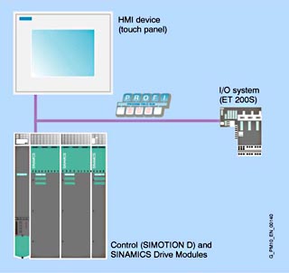 Комфортные пакеты SIMOTION Easy Set – фасовка и упаковка содержат все существенные компоненты автоматизации, такие как управление, модули привода, система периферийных устройства и опционально панель управления. Управление, система периферийных устройства и панель управления соединены друг с другом по PROFIBUS (в будущем также PROFINET).