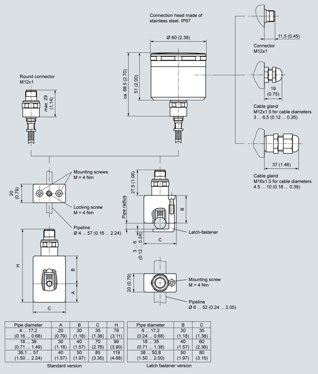Resistance thermometers in clamp-on technique, round connector, field enclosure, cable gland, versions, dimensions in mm (inch)