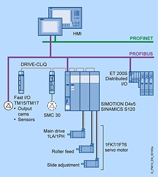 В представленной концепции автоматизации как аппаратная платформа выбрана SIMOTION D с системой привода SINAMICS S120. Как управление машины, так и технологические функции программируются на SIMOTION D, управляются и контролируются через децентрализованную периферию ET200. Через встроенные в привод быстрые модули периферийных устройства TM15 или TM17 управляются кулачки и соответственно принимаются сигналы быстрых датчиков для контроля процесса. Двигателем управляет модуль двигателя SINAMICS S120.
