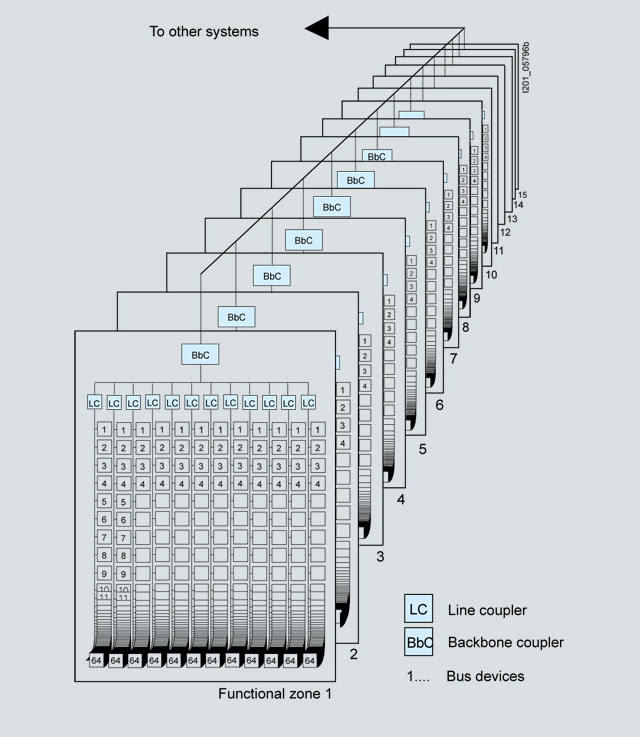 Although more than 14,000 devices can be interconnected in a single unit, the clear-cut logic of the system is preserved. Telegrams only ever overstep the interfaces to other lines and function areas if they are needed in those areas. This minimizes the telegram load on the main line. Line/backbone couplers carry out the necessary filter function.