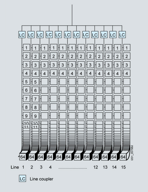 Fifteen areas can be joined together by means of backbone couplers, which are connected to the so-called backbone lines, in order to form a larger unit.