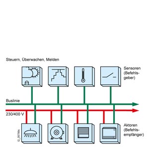 All the connected bus devices can exchange data over a common transmission path, the bus. Data is transmitted in serial mode and in compliance with precisely defined rules (the bus protocol). The data to be transmitted is packed into a telegram and sent over the bus from a sensor (the command output) to one or more actuators (the command receiver).