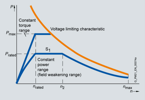 Кривая характеристики показывает типичное соотношение между скоростью и мощностью для 1PH8 двигателя для постоянного режима (S1) в соответствии с IEC 60034-1.
