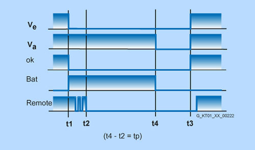 The buffer time tp set on the DIP switches is started at the user-selectable time t2 by means of the signal "Remote timer start" (signal level = 0 at pin 7 of the 9-pin serial interface following previous signal chart according to operating instructions).