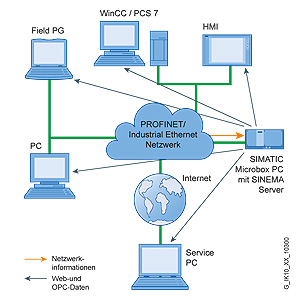 Network information prepared by SINEMA Server can be called up by any clients via a Web browser or OPC interface.