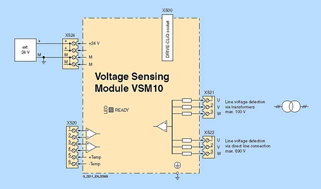 Модуль датчика напряжения VSM10 обменивается сообщениями по DRIVE-CLiQ с модулем управления CU320 или SIMOTION D.