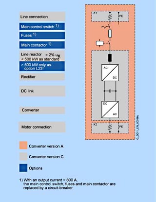 Базовая конструкция преобразователя SINAMICS G150 с дополнительными опциями на входе, которые определяют исполнение