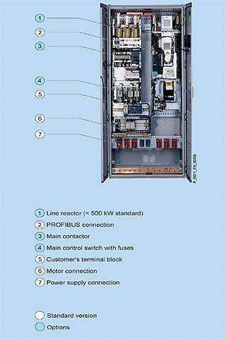 Имеется широкий набор дополнительных компонентов (опций) в зависимости от варианта исполнения шкафа. Это позволяет оптимально адаптировать комплектный привод к требованиям конкретного объекта.