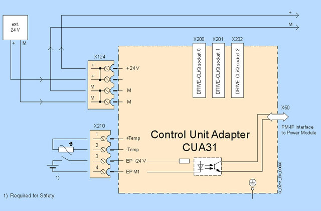 Адаптер блока управления CUA31 устанавливается на Силовой модуль книжного формата и подключается к Блоку управления CU320 или SIMOTION D через соединение DRIVE-CLiQ.