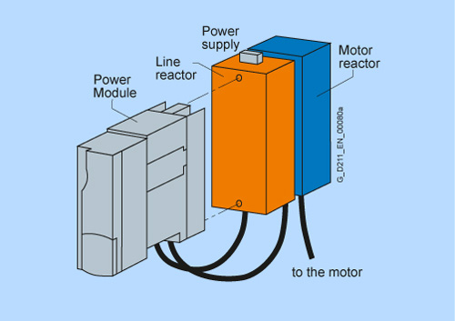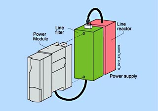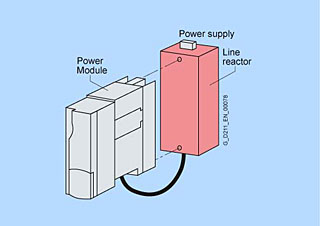 Сетевой дроссель оборудован клеммами для подключения сети и готовами кабелями для подключения PM340. При установке клеммы для подключения сети располагаются сверху для типоразмеров от FSA до FSC, и снизу для типоразмеров FSD и FSE.