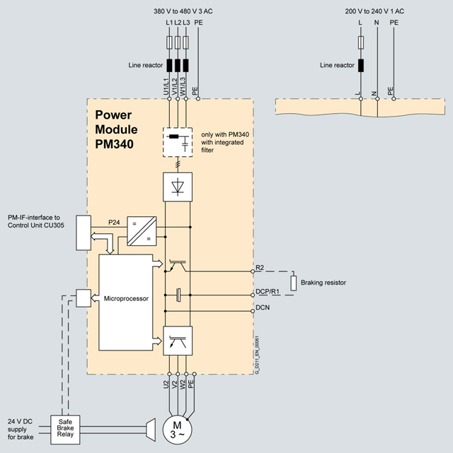 Силовой модуль PM340 взаимодействует с модулем управления CU305 через интерфейс PM-IF.