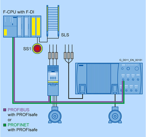 Структурная схема функций SS1 и SLS для приводных систем SINAMICS G120 и SINAMICS G120D