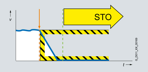 Благодаря функции STO незамедлительно прекращается подача питания на двигатель, в результате чего привод останавливается. Функция «Безопасное отключение крутящего момента» может использоваться в случаях, когда привод следует остановить достаточно быстро или вращение привода по инерции может оказаться небезопасным.
