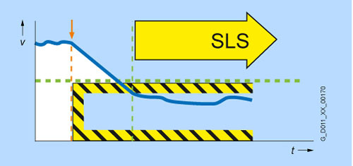 Функция «Безопасное ограничение скорости» используется для мониторинга скорости привода с учетом максимальной программируемой скорости. Можно задать четыре предельных значения. Если активирована функция SOS, установка скорости не изменяется автоматически. После активации функции SLS система управления высшего порядка должна снизить скорость привода до допустимых значений.