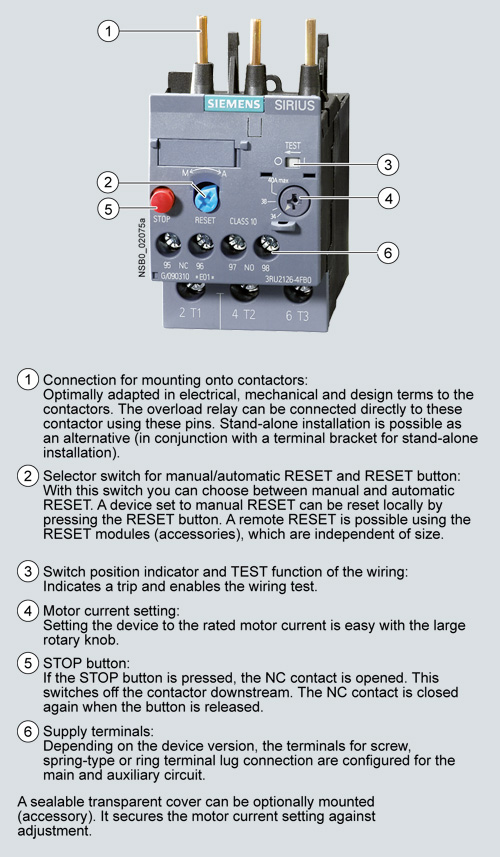 Тепловые реле перегрузки 3RU21 до 40 A разработаны для обратно-зависимой защиты потребителей от чрезмерного перегрева из-за перегрузки или выпадения фазы для нормальных условий пуска ( "Функции" - см.http://www.siemens.de/lowvoltage/support). Перегрузка или выпадение фазы приводят к превышению тока электродвигателя выше номинального. Превышение уровня тока приводит к нагреву и изгибу биметаллических пластин реле и, как результат, к срабатыванию механизма расцепления и изменению коммутационного состояния блок-контактов. Блок-контакты в свою очередь отключают нагрузку посредством контактора. Время срабатывания реле зависит от разницы между током, превышающим номинальный и номинальным рабочим током Ie ("Время-токовые характеристики " - см.http://www.siemens.de/lowvoltage/support).