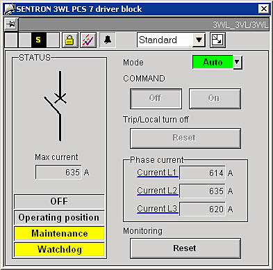 Она включает драйвер блок, блок диагностики и лицевую панель. Блоки, реализованные в AS системе SIMATIC PCS7 обеспечивают лицевые панели значениями тока, мощности и различными энергетическими параметрами, генерируют сообщения и устанавливаеют соединение со станцией обслуживания SIMATIC PCS7 Maintenance Station.