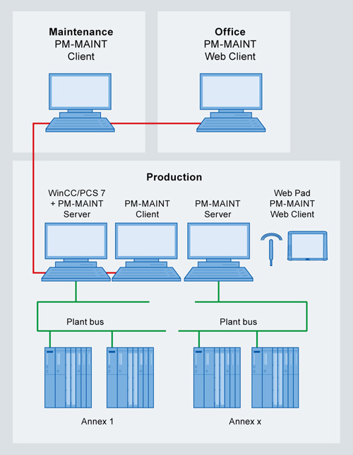 PM-MAINT является масштабируемой системой и конфигурируется в соответствии с Вашими требованиями как одноместная станция или как распределенная клиент/серверная архитекиура. PM-MAINT может устанавливаться в дополнение к SIMATIC PCS 7 OS ПО на одноместной станции, сервере или клиенте.