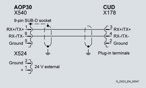 AOP30 и привод SINAMICS DC MASTER осуществляют связь через последовательный интерфейс RS485.
