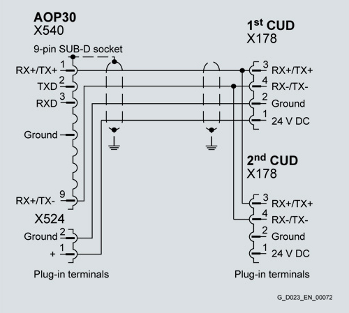 Распределение кабеля RS485 при использовании двух CUD (24 V источник питания от одного CUD) – макс.длина кабеля 50 м