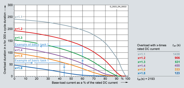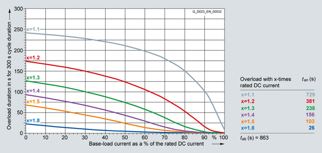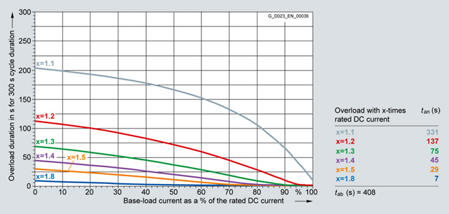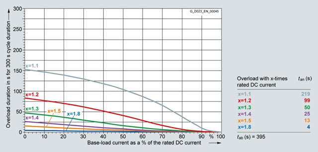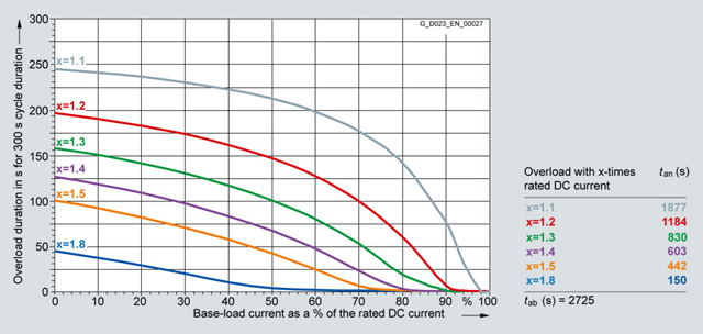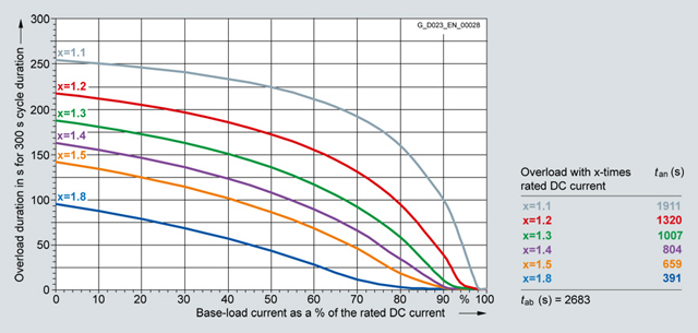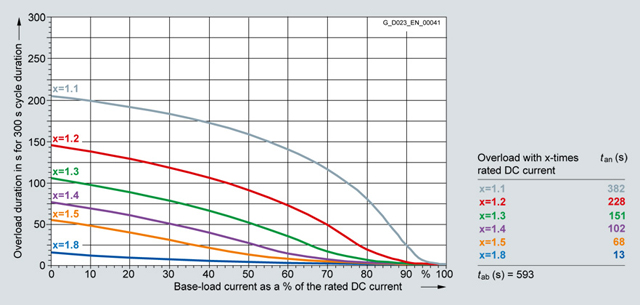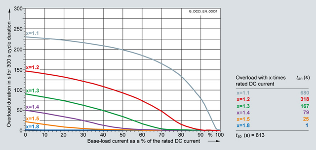 Each limiting characteristic represents a unit-specific maximum base-load current for a specific overload factor (limiting base-load current, specified as a % of the rated DC current) over the minimum base-load duration (limiting base-load duration). For the remaining duration of the duty cycle, the maximum permissible overload current is determined by the overload factor. If no limiting characteristic has been specified for the required overload factor, then it will be subject to the limiting characteristic for the next highest overload factor.