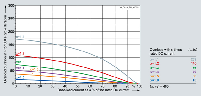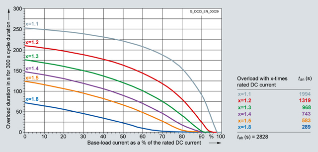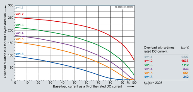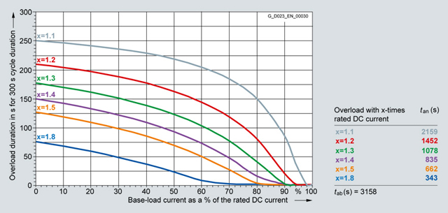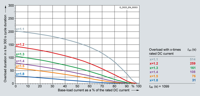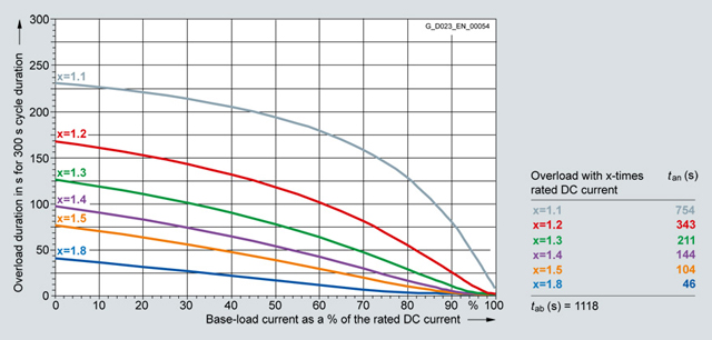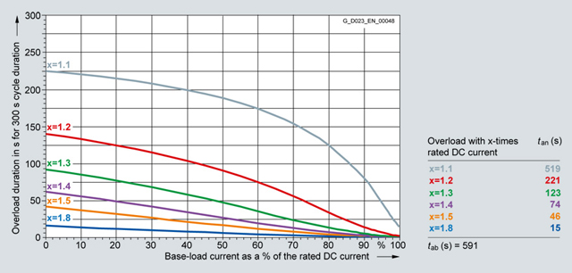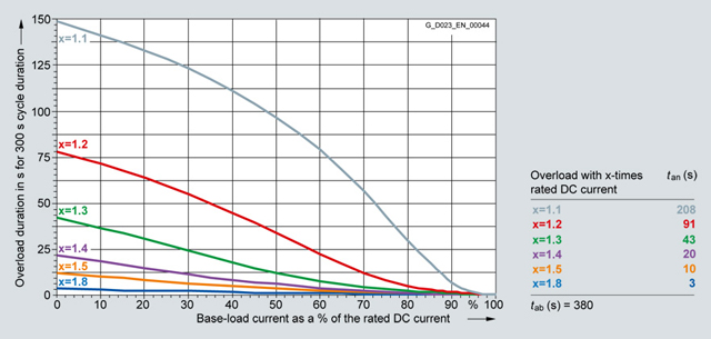 The absolute upper limit for the value of the overload currents is 1.8x the rated DC current. The maximum overload duration depends on the time characteristic of the overload current as well as on the load history of the unit and also depends on the specific unit.