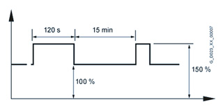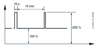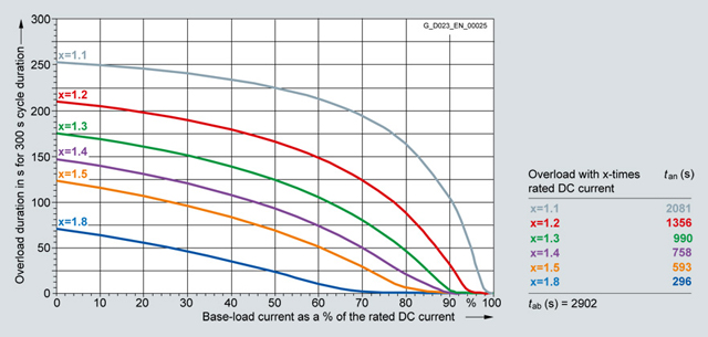 Each overload must be preceded by an underload (load phase with load current < rated DC current). Once the maximum permissible overload duration has elapsed, the load current must return to at least an absolute value the rated DC current.