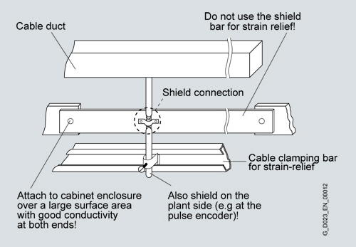 If it is not possible to physically separate the encoder and motor cables, the encoder cable must be decoupled either using a partition or by routing it in a metal conduit. The partition or metal conduit must be grounded at several points.