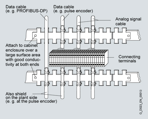 Ground the shields of digital signal cables at both ends (source and destination), ensuring maximum contact area and good conductivity. In the event of poor equipotential bonding between the shield connections, run an additional equipotential bonding conductor with a cross-section of at least 10 mm2 parallel to the shield for the purpose of reducing the shield current. Generally speaking, the shields may also be connected to the cabinet enclosure (ground) at several points. The shields can be connected several times even outside the control cabinet.