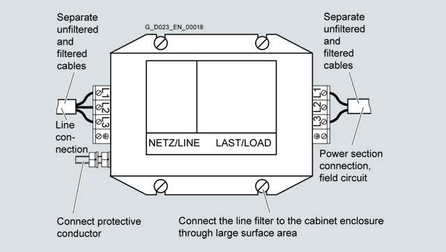 Ensure that the radio interference suppression filter is located close to the suspected source of interference. The filter must be attached to the cabinet enclosure, mounting plate, etc., through a large surface area. Incoming and outgoing cables must be physically separated.