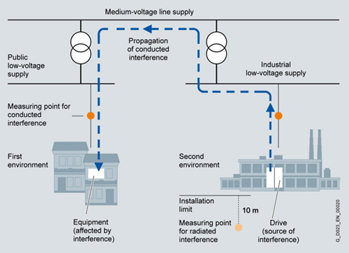 Residential buildings or locations at which the drive system is directly connected to a public low-voltage supply without intermediate transformer are defined as thefirst environment.