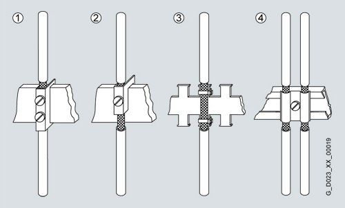 Additional diagrams show details that are not immediately clear in the overview diagram and which may also have an effect on the resistance to interference/interference emission levels of the cabinet as well as different shield connection techniques.