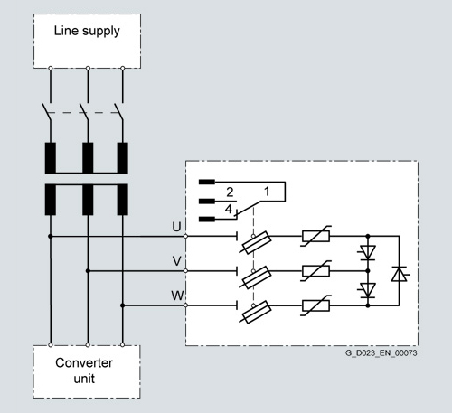 SICROWBAR AC overvoltage protection is used to protect power semiconductors (thyristors and diodes) in converters against overvoltages between the phases of a three-phase line supply. The range of applications is not restricted to protecting DC drive converters, but can also be used for infeed/regenerative feedback units of AC drive systems that are equipped with thyristors. Overvoltages that occur on the AC side of converters are mainly caused by switching operations when disconnecting from the line supply at the transformer primary. This applies both to operational switching operations (shutdown under no-load conditions) as well as in the case of a fault (shutdown under load).