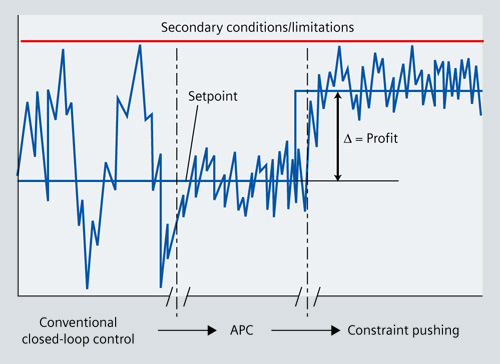 APC enables unwanted fluctuations of process variables to be reduced and thus enables setpoint values to maintained closer to critical secondary conditions (constraint pushing), without violating these limits. While this reduces the work for the operating personnel, it also enables throughput and product quality to be improved and a noticeable reduction in the use of raw materials and energy consumption.
