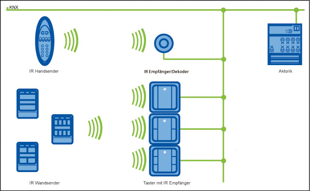 IR products are available for the remote control of room functions. Compared to radio solutions, IR is particularly interesting because