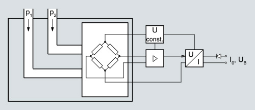 The piezo-resistive measuring cell (ceramic membrane) has a Wheatstone bridge circuit, on which the operating pressure P1 and P2 of the media acts at both ends.