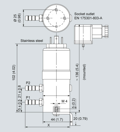 SITRANS P250 differential pressure transmitter with socket outlet to EN 175301-803-A, dimensions in mm (inch)