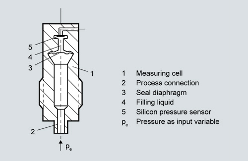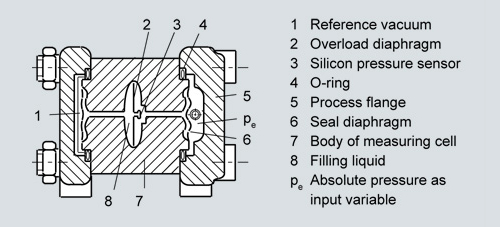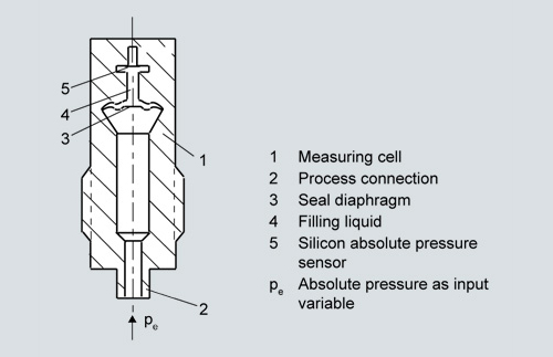 The input pressure pe is transmitted through the seal diaphragm (6, Figure "Measuring cell for absolute pressure from differential pressure series, function diagram") and the filling liquid (8) to the silicon pressure sensor (3).