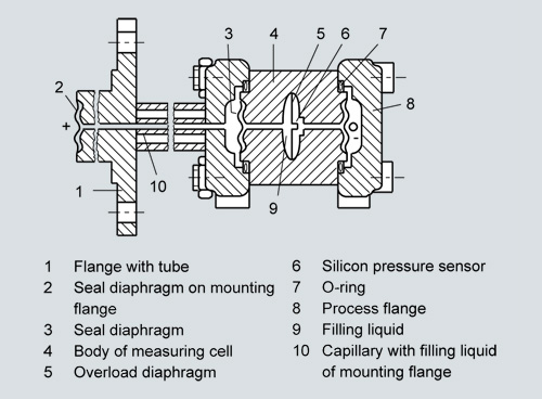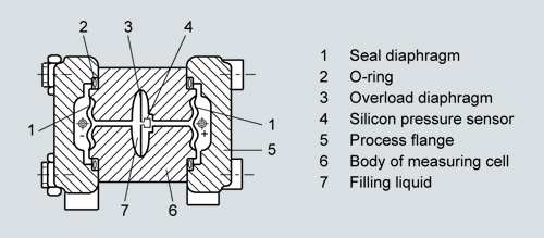 An overload diaphragm is installed to provide protection from overloads. If the measuring limits are exceeded, the overload diaphragm (2) is flexed until the seal diaphragm rests on the body of the measuring cell (7), thus protecting the silicon pressure sensor from overloads.