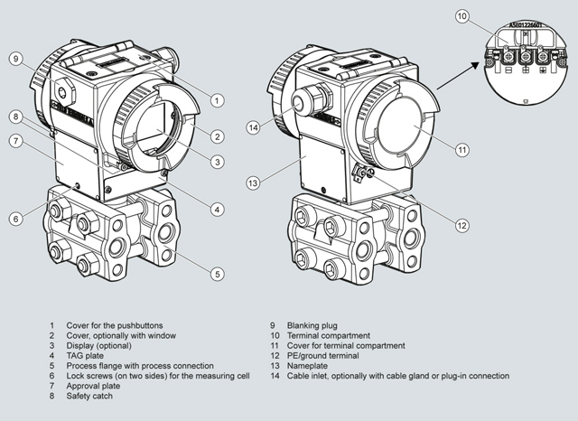 - Beneath the electronic housing is the measuring cell with its process flanges at which the process connections are available. The modular design of the pressure transmitter lets you swap the measuring cell, electronics and connection board as required.