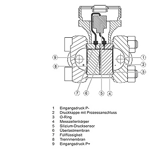 - The differential pressure applied to the measuring cell is transmitted via the seal diaphragm and the filling liquid to the silicon pressure sensor.