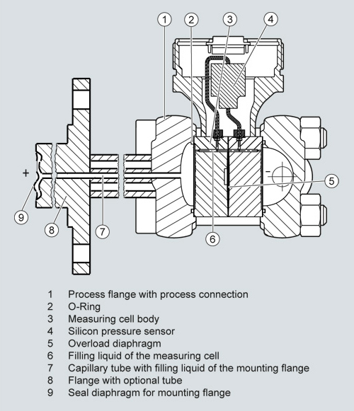 - The differential pressure is transmitted via the seal diagrams and the filling liquid to the silicon pressure sensor.