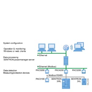 - Integration of devices with RS 485 interface (ModbusRTU) through Modbus gateway, e. g. the 7KM PAC4200 can be used as gateway